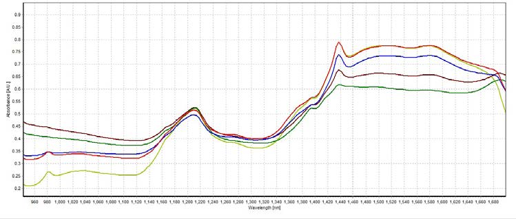 在1209.81 nm處,吸光度由高到低分別為:可可含量為78%的黑巧克力樣品,可可含量為92%的黑巧克力樣品,白巧克力樣品,廉價牛奶巧克力樣品。在1437.32 nm處,吸光度由高到低分別為:白巧克力,廉價牛奶巧克力,牛奶巧克力,可可含量為78%的黑巧克力樣品,可可含量為92%的黑巧克力樣品。由此可以假設這個峰值表示糖含量。