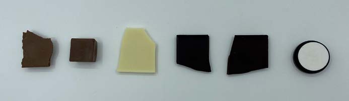 圖1:實驗中使用的五種巧克力樣品和白參考