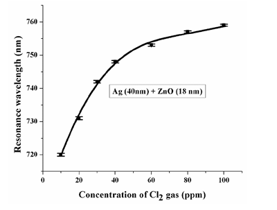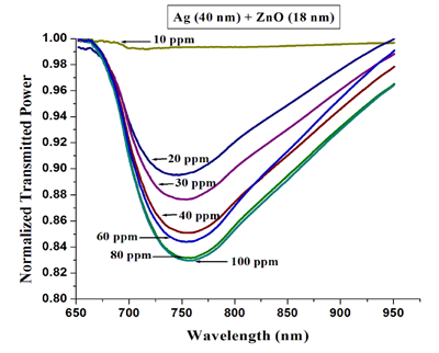 現(xiàn)在,將SPR傳感器集成到光纖探頭中,可以在危險環(huán)境中部署目標(biāo)傳感器。這些探頭通常是通過剝?nèi)ヒ徊糠止饫w的包層,然后在該部分上涂敷一層金屬膜層,然后再涂敷一層介電膜層來生產(chǎn)的。位于德里的印度理工學(xué)院的一個小組最近發(fā)表了使用此類型探頭的研究結(jié)果,他們在光纖芯上先鍍一層銀,然后再鍍一層氧化鋅用來檢測氯氣[1]。在他們的實驗中,他們把Avantes公司的AvaLight-HAL鹵鎢燈發(fā)出的寬譜光耦合到探頭中。當(dāng)氯氣分子與氧化鋅相互作用時,會導(dǎo)致生成氯化鋅,改變相對介電常數(shù),從而改變表面等離子體的波長。由于一小部分光可以在光纖的包層內(nèi)傳播,因此導(dǎo)致透過光譜發(fā)生變化,他們使用了Avantes公司的AvaSpec-ULS3648-USB2光纖光譜儀進行了測量。下圖1顯示了測得的光譜隨氯氣濃度的變化,檢測范圍為10ppm至100ppm。