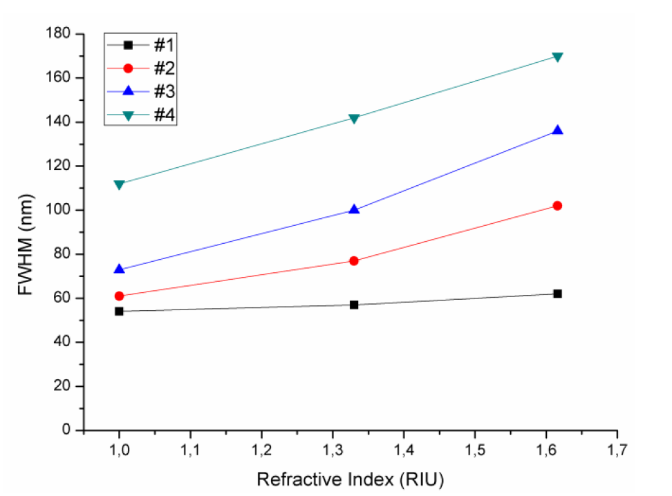 圖2:四種不同厚度的濺射法金納米顆粒膜的FWHM值與環(huán)境折射率的函數(shù)。[2]